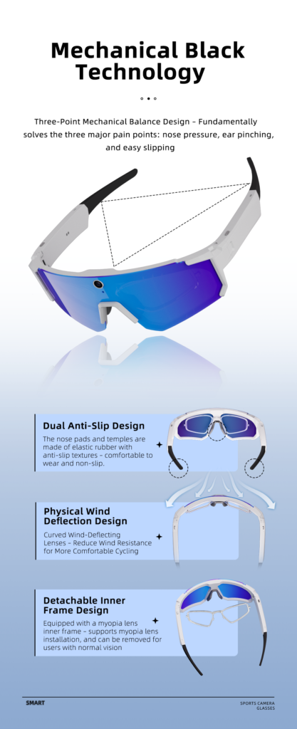 Stability is paramount. The V06 uses a 3-Point Mechanical Balance Design, specifically engineering out the pressure points on the nose bridge and ears. Even during intense skateboarding or trail running, it stays locked in place. Note: The V06 is rated IP54. It handles sweat and rain effortlessly, but unlike the W640 (IP66), do not rinse it under a high-pressure tap or submerge it. This is a trade-off for its lightweight profile (housing a 260mAh battery).
