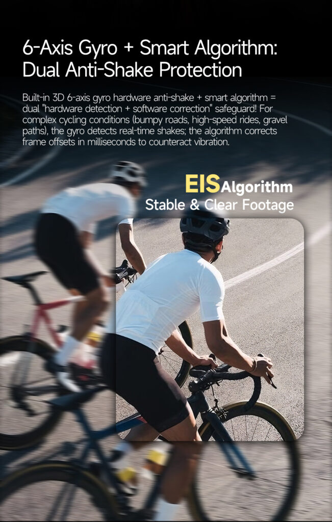 Standard EIS is fine for walking, but the high-frequency vibrations of cycling demand more. The W640’s killer feature is the built-in 3D 6-Axis Gyroscope. This isn’t marketing fluff. The hardware physically detects millisecond-level tilts, allowing algorithms to compensate instantly. Tested on gravel roads, the 1200P footage remains incredibly stable—almost gimbal-like—completely eliminating the nausea-inducing “jelly effect”.